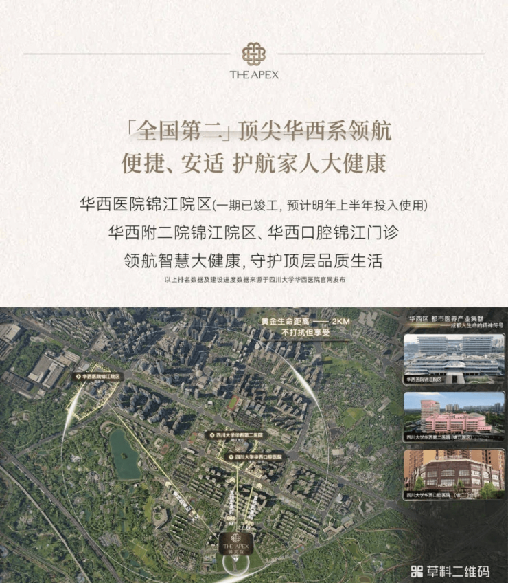 汇聚华西医院锦江分院(在建)、华西附二院锦江院区、华西口腔门诊等顶尖医疗机构,构建全生命周期健康保障体系。