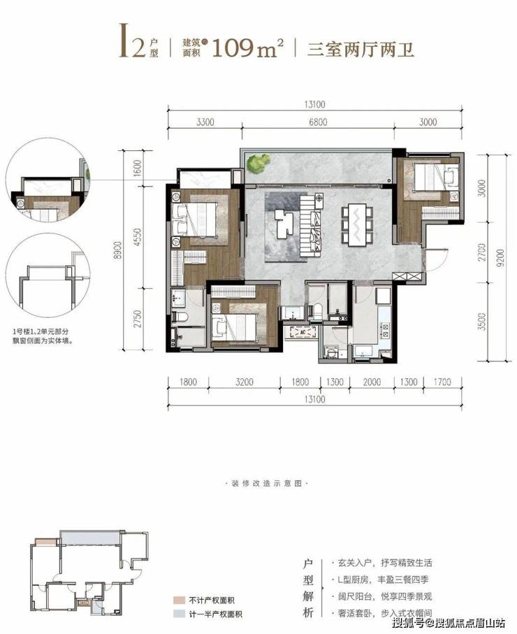 部分户型赠送很大,比如88㎡G1户型有接近半个房间都是送的;阳台延续了改善路线做得大,比如109平套三的阳台都有6.8米长。