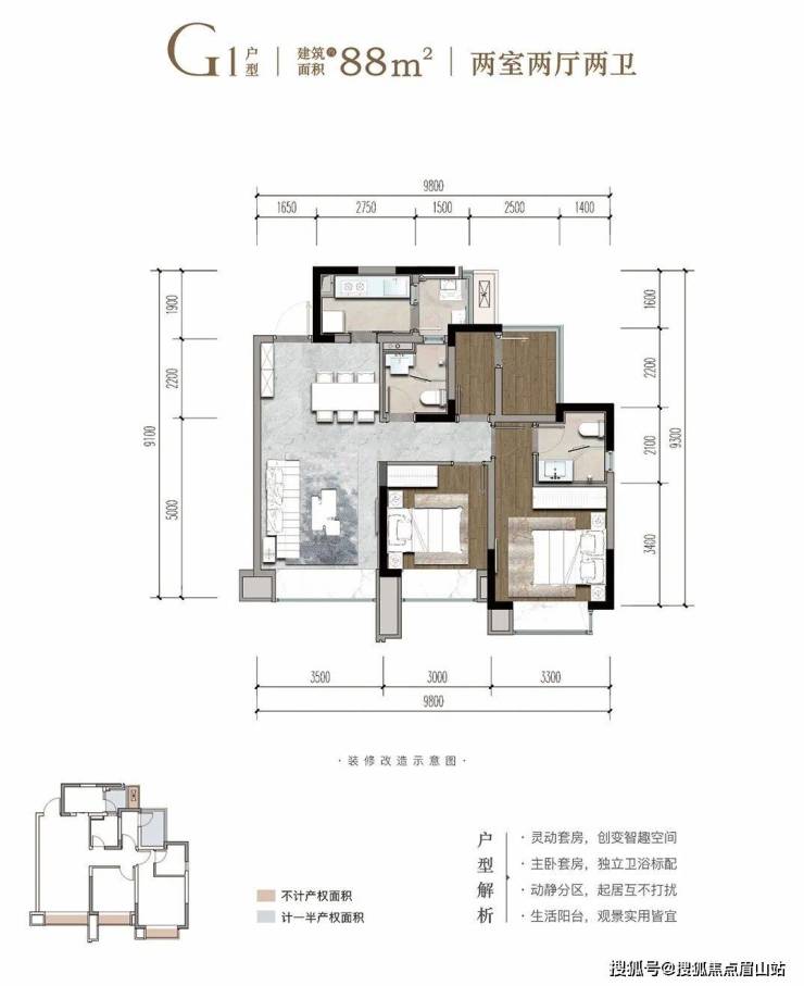 部分户型赠送很大,比如88㎡G1户型有接近半个房间都是送的;阳台延续了改善路线做得大,比如109平套三的阳台都有6.8米长。