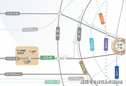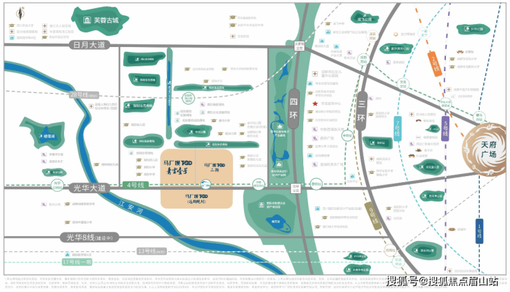 城市快速路网络:日月大道、光华大道、光华8线(待建成)与四环相连,畅通无阻。教育——城西优质学府荟萃,教育氛围浓郁城西教育热土,周边各大优质学府齐聚,实验小学附属幼儿园、泡桐树幼儿园(在建)、胜西小学康乐分校(规划落地待建)、泡桐树小学桐乐校区、城西教育科学院附属学校(规划落地待建)、成都市实验小学附属幼儿园(马厂坝分园)。商业——高品质商业集聚,15分钟畅享繁华。青羊万达(地铁只有4站)、鹏瑞利广场(地铁只有3站)、新光天地(地铁只有3站)、合生汇(地铁只有3站)等商业中心,打造充满活力的商业区。城市公园——城市中的绿色宝藏,三大城市公园在家门口等你探索。绿色印记:围绕着成都环城生态公园、非遗博览园、江安河绿廊,构建出诗意般的绿色家园。绿色延伸:绿色延伸系统贯穿整个城市边界,连接康河景观轴、土龙路景观轴、中央公园,延续美好生活。