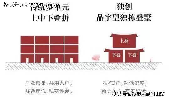 项目的建筑构型,创造性地设计了3户式品字形结构。传统的叠拼别墅,除了下叠户型拥有院落外,上叠户型仅仅只有露台(中叠户型没有户外空间)。而院落是衡量“墅居”舒适度的首要标准。本项目独特的建筑结构,直接舍弃了中叠户型,换来了珍贵的“院落”空间,牺牲了大量的可售建筑面积,使得下叠户型和上叠户型均有“大尺度”的亲地院落。