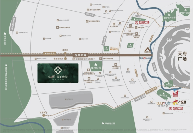 🚊交通——三横五纵三地铁,立体交通路网·三横:光华大道、日月大道、东坡路西延线·五纵:中环路、西三环、培风路、成飞大道、成渝环线·三地铁:地铁4号线、地铁9号线、地铁13号线(建设中)*本项目距4号线蔡桥站直线距离仅约300米*本项目距13号线瓦窑滩站直线距离约700米