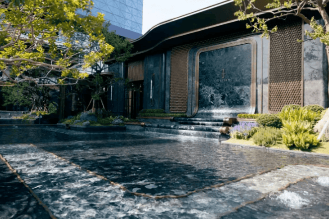 豪宅级立面与归家礼序:项目外立面采用弧形铝板勾勒,并配有区域唯一的封窗阳台,整体质感高级。归家体验始于约70米宽、7.1米挑高的酒店式大门,穿过110米景观中轴与七重度假园林,仪式感十足。
