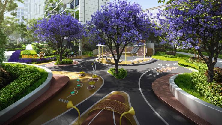 森居花园秘境 共鸣奢隐绮梦下楼即享的森居花园,以“一轴、两庭、双环、四园”演绎多重漫生活剧场。于花木葱茏中,配置橱窗花园、浮岛乐园等功能区,演绎时尚奢雅而又诗意盎然的都市秘境。