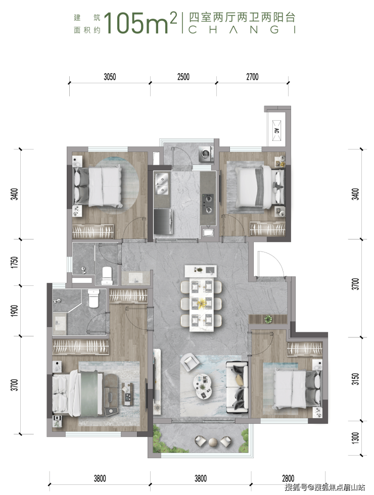 【105㎡星辉-四室两厅两卫两阳台】一梯两户,通透纯板式南北朝向,南向三开间,南北双阳台市场同级稀缺四房布局,双主卧套房LDKB一体化,双一字型操作台,流线操作不干扰270°环幕阳台采光,极致视野面约21㎡超大主卧,3.8m大面宽,双衣柜布局