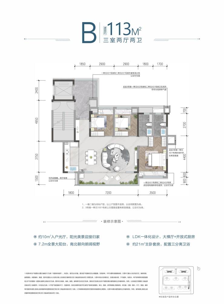 建面113㎡三室两厅两卫: