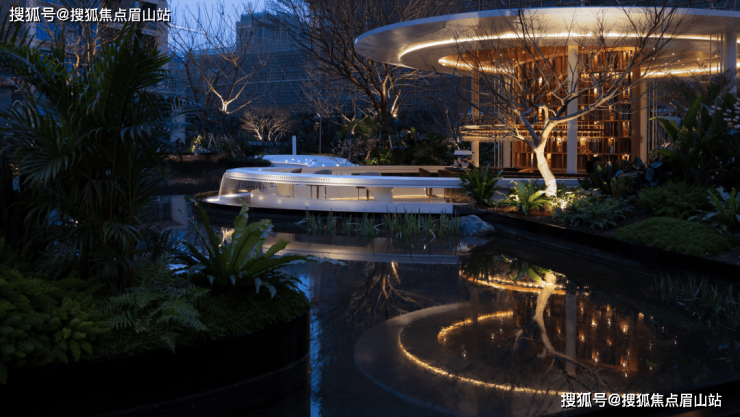中庭园林以湖屿森境为理念,森林为底,引水环绕,“一湖一桥双庭三境”,用艺术放大自然,让建筑与自然相融生长。
