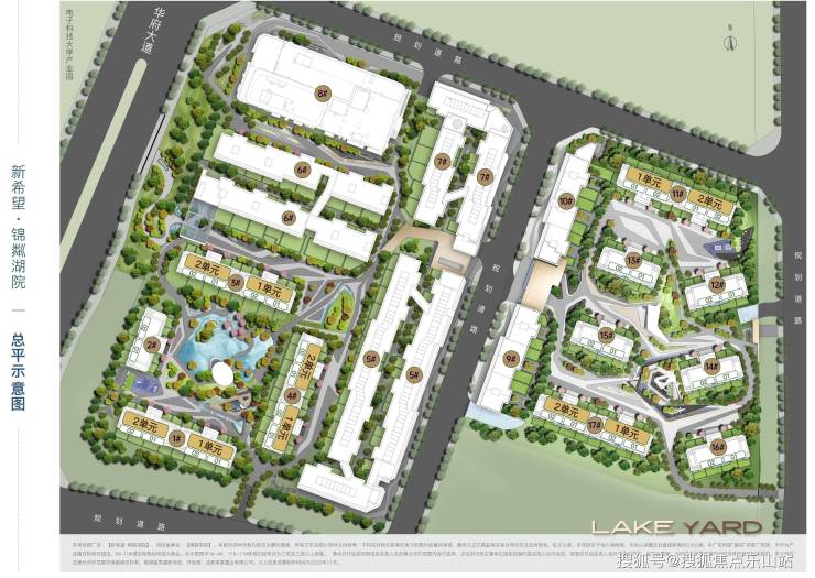 新希望·锦粼湖院总占地约88亩,容积率仅2.0,项目分东西两个地块开发,产品由11栋湖居小高层、5栋定制商墅及1栋自持商业综合体组成,住宅 548 户。