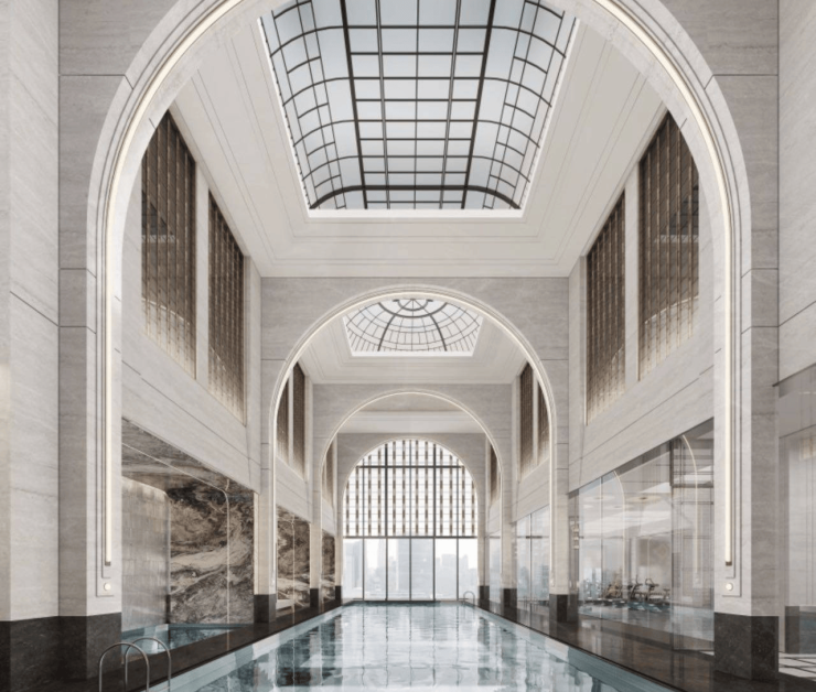 项目复刻其经典装饰主义,约10m挑高大堂,挑空拱门架构的恒温泳池、孔雀廊般的艺术展廊,层叠线条,艺术家真品装置等,让峯层生活从此同频华尔道夫