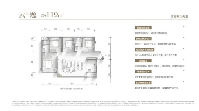 此户型为经典的四房横厅设计,做到了户型方正通透,居家动线优秀。横厅布局带来开阔的公共活动空间,连接景观阳台,四房配置充分满足多孩家庭或需要独立书房的功能需求,兼顾了尺度感与实用性。