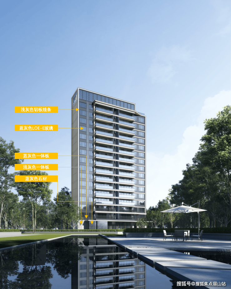 明信·公园四季的建筑风格是简约的现代风格,颜色以米白、蓝灰为主,整体呈现“少即是多”的包豪斯设计哲学。在建筑底部近人面使用了部分深灰石材+蓝灰色一体板,增加品质感;在建筑边缘的纵向线条上,使用了少量铝板。