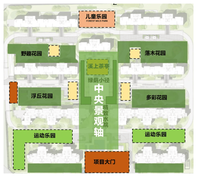 内部园林体系:社区内部打造“一轴四进六园”的新中式园林,规划有7大主题花园及5大架空层全龄功能空间,满足从儿童到长者的各类休闲、社交与活动需求。