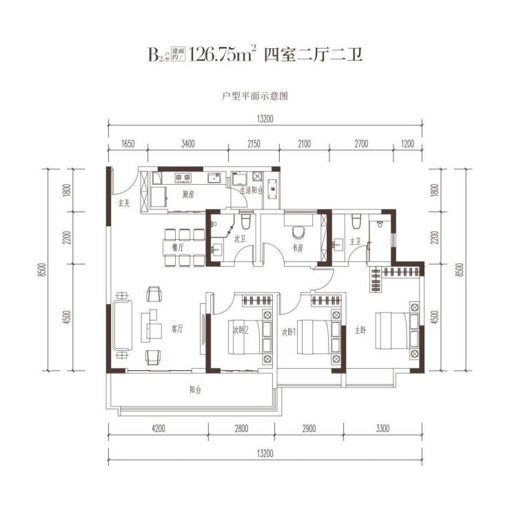 B1 户型(建面约 126.75㎡):四室两厅两卫,总价 183-195 万,经典四房格局适配三代同堂;7 米观景阳台 + 轩敞主卧套房,采光通风俱佳,空间利用率高,是刚需家庭的性价比之选。
