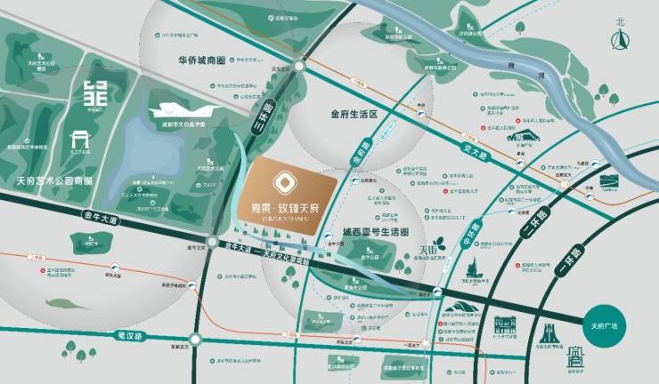 ——两大龙头片区引领 助推城市界面更新,雍景致臻天府位于“国宾—茶花”两大片区交汇的中心位置,享两大片区政策发展红利,依托科创服务、生态人文等布局,赋能区域发展,助推打造高品质城市界面,升值潜力大。湖园头排:自成都提出“公园城市”概念以来,先后于主城打造三大天府级公园,分别是天府广场的天府文化公园、天府新区的天府中央公园及城西国宾板块的天府艺术公园。作为省市级重点工程、第31届世界大运会配套项目的“文旅高地”,天府艺术公园片区规划面积约3033亩,以金牛宾馆为核心,结合片区“三湖三坊三地标”建设,重现川西院落林环水绕的“蜀风揽胜画卷”,打造集艺术、文化为一体的城市新地标。雍景·致臻天府位于天府艺术公园头排位置,尽享片区丰富生态、文化、艺术、产业资源,打造品质人文社区。主城臻稀观景台,与国宾所望略同,凭借绝佳落位, 一览天府艺术公园全貌,与金牛宾馆天府楼观景台对湖相望