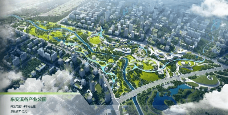 西拓区重点工程东安溪谷产业公园规划面积1.4平方公里,总投资约21亿元,将连接环城生态带与东安湖公园。
