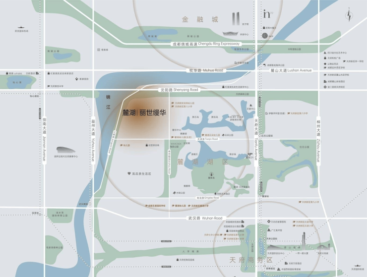 超百万方的世界级商业版图,约5.5万㎡麓坊、约35万㎡麓湖水镇(规划建设中)、约20万㎡怡心湖银泰城(建设中)、约30万㎡天府大悦城、约25万㎡天府和悦广场、约29万㎡天府招商花园城等
