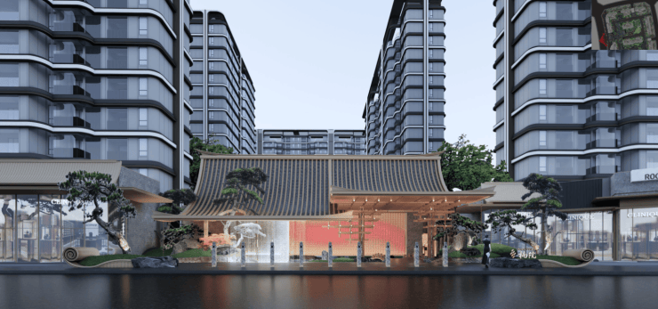 宋式美学建筑:外立面选用仿石漆与香槟金矩管,搭配双层中空 Low-E 玻璃,融入楠木饰面、琉璃瓦等东方元素,兼具现代质感与古典韵味,成为可收藏的美学作品;