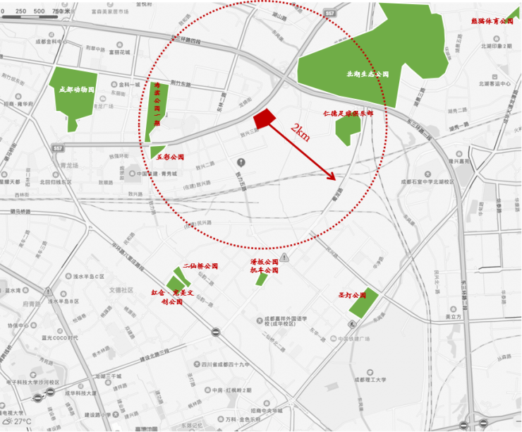九大公园围绕,海滨公园、五彩公园、成都动物园、二仙桥公园、红仓·完美文创公园、滑板公园、熊猫体育公园、仁德足球公园;