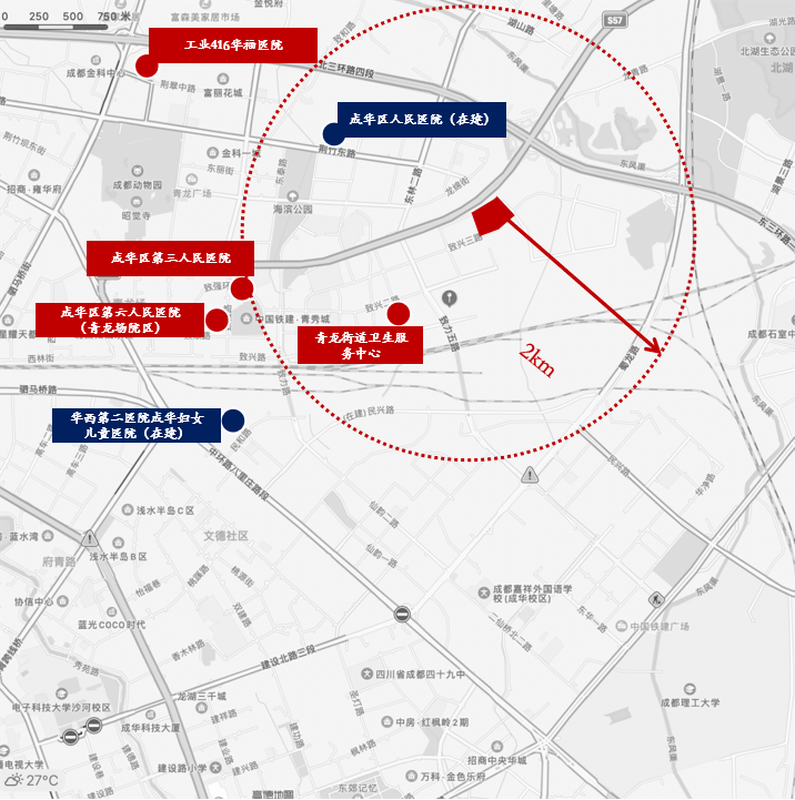 成华区人民医院(在建)、华西第二医院成华妇女儿童医院(在建)、成华区第三人民医院等,区域内规划修建多所三甲公里医院,加快了区域医疗配套完善,提供了有保障的公立医疗资源。