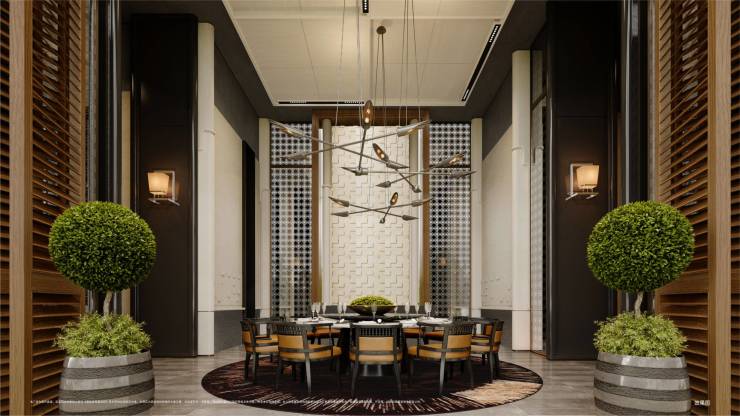 以迈阿密瑞吉会所和苏宁钟山高尔夫会所为空间蓝本,以蜀锦、茶文化、皮影戏等巴蜀在地文化为艺术源泉,打造出成都东意西境美学的高端会所经典范本。