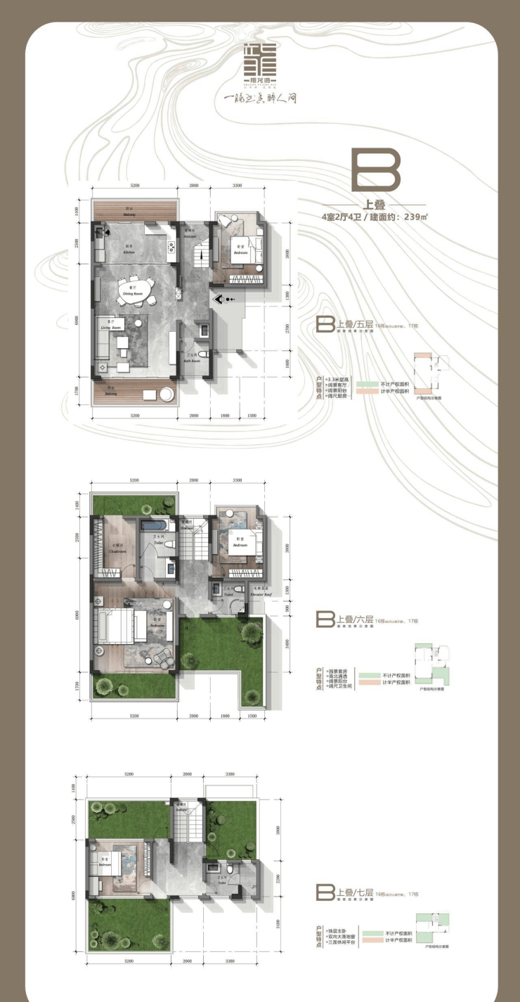 【基本信息】 总占地面积:42亩,容积率:1.5,绿化率:35%,总户数:184,物业费:4.9元/㎡,楼层总高:6+1,3,交付标准: 清水交付,交房时间: 预计2023年12月31日,产品面积:A户型 建面约235㎡~271㎡;B户型 建面约237㎡~284㎡;C户型 建面约209㎡~269㎡;E户型 建面约410㎡~470㎡