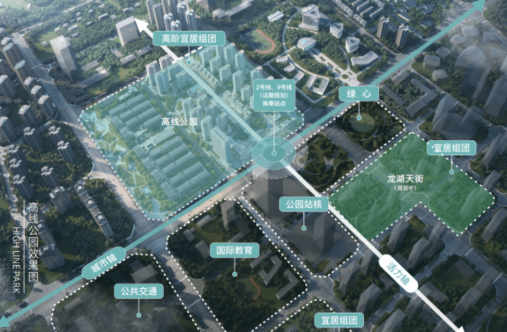 在项目的整体布局上,万科高线公园住宅外围基本被公园包围,社区则像“藏”在公园里;南侧的写字楼、高线客厅等商业配套迎接行政学院TOD地铁站的人流;沿楠木街分布的商业街和中心位置的高线邻里中心、LINK剧场则将合力营造有“烟火气”的社区,并解决业主的日常商业购物需求。