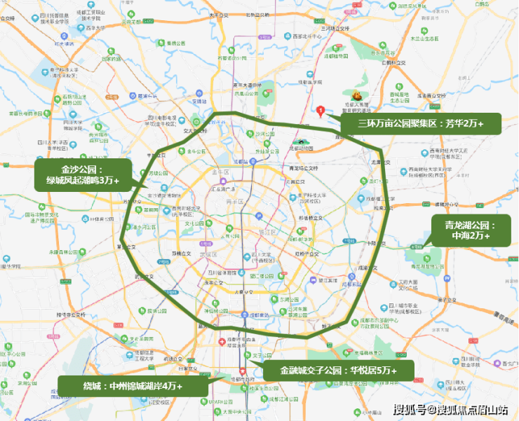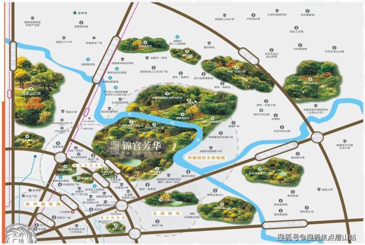四面环公园三面环水,以区域约3000亩北湖公园、约2100亩凤凰山公园、约1000亩大熊猫繁育基地、约774亩植物园、约6000亩198公园、约1000亩银杏园、约4200亩国际熊猫风情小镇7大公园,接驳成华区水绿生态空间,以近万亩自然绿肺构筑广袤的生态屏障,再现“花重景观城”城市盛景。