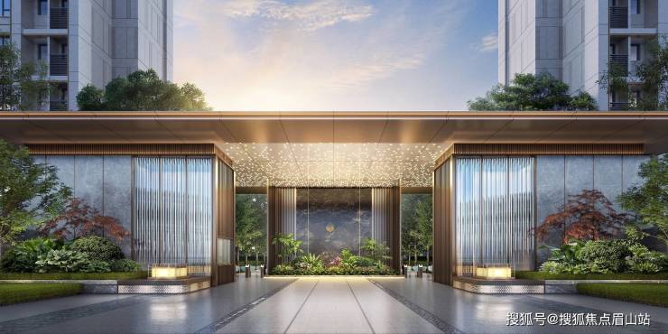 升级X空间,更加有层次感,整个立面更加立体、干净、高级建筑基座外墙主要采用石材和铝板,标准层采用真石漆 屋顶采用大面积银灰色穿孔铝板分割主体与屋顶飘板,顶部采用香槟色金属漆的处理方式,丰富建筑形象,增强地标感。五星级酒店环岛式主大门,高约5.4米,宽约34米,做足豪宅气势