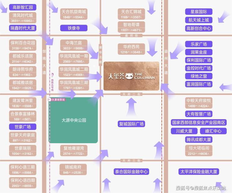 1、天府大道、益州大道、剑南大道3大主干道,全城畅行;2、1/5/16/18/20五线地铁(部分规划中)环绕;3、距离地铁5号线大源站约800米;4、天府国际机场、双流机场,商务出行精准直达。作为未来的CBD商务封面,大源片区户籍人口超过10万,常住人口超过75万,人流强度达18万/平方公里。周边500强企业云集,近30万商务经营人群。区域消费力持续看涨,超值潜力未来可期。