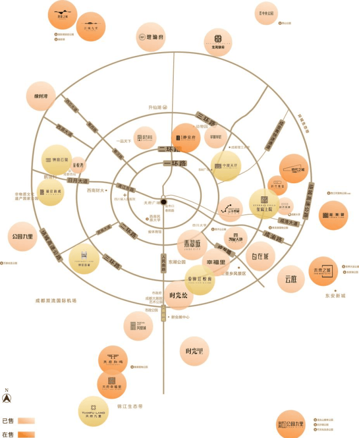 以神仙树为始,城南品质住区,依次沿剑南大道排开,神仙树、金融城CBD、锦城湖、大源商务区、大源南住区、锦江生态带、怡心湖产城区、浅水湾等成都壕宅住区,因剑南大道而串联。