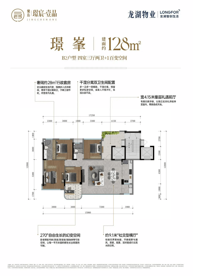 此户型为平层产品的旗舰,空间尺度最为阔绰,实得面积约170㎡。三卫配置与开阔的厅堂空间相结合,充分满足了高端改善家庭对居住舒适度、功能分区及社交待客的全面要求,彰显大户风范。