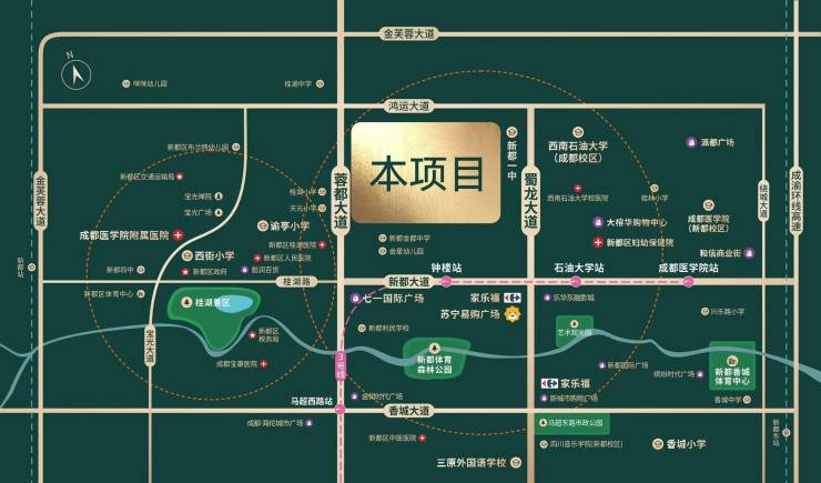 教育配套:晨阳幼儿园、桂湖幼儿园、金星幼儿园、谕亭幼儿园、桂湖小学、天元小学、谕亭小学、毗邻新都一中、西南石油大学、成都医学院、四川音乐学院