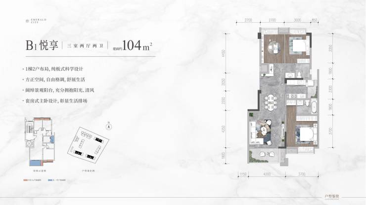104 ㎡,1T2 三室两厅双卫 全飘窗功能三房,视野进阔,采光通透,入户横轴 9.6 米,连通阳台 11.4 米,纯板式结构,通透 采光,主卧 20.35m²套房设计,带独立卫浴,1.8m×4.2m 阳台面积,大进深灵活空间布局。