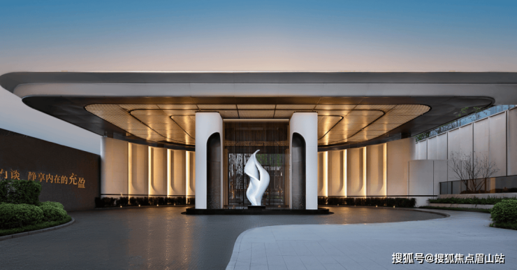 一方面是社区大门本身的升级,约31.4米长、8米高(仅为展示区已呈现的大门)的奢阔尺度,对称与开敞式的奢华环岛前场空间,与青岛路相接,可实现轿车环绕落客,超五星级酒店迎宾落客的尊崇感尽显;用材与设计也尽显高级,整体设计充满圆弧的曲线艺术,落客前场的仿铜色金属型材环岛屏风+两侧弧形仿铜色穿孔铝板+米白莱姆石设计,搭配雕塑与水景迎宾,顶部设计了仿铜色穿孔铝板星空顶,打造悬浮于璀璨“星空”下的豪奢归家体验。
