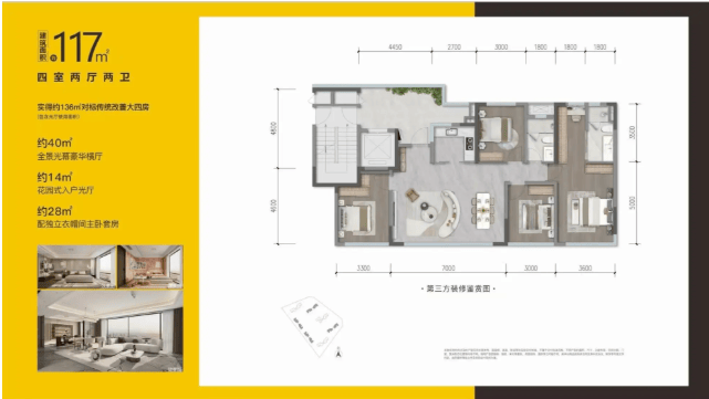 项目主打建面约117㎡和128㎡的精装四房产品。户型设计以“高实得率”为核心亮点,通过创新的空间布局,在标准面积段内创造出远超寻常的实用空间,并强调家庭社交场景与个性化成长的自由度。