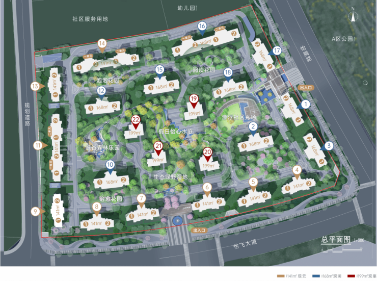 【A区湿地公园】公园总占地面积约17万㎡,以“休闲漫步区”、“湖畔运动区”、“水岸乐活区”、“艺术地形区”四个区域进行组成,并有怡飞大道划分为南北两区,北区规划休闲运动、户外营地为主要功能;南区以亲子乐园、艺术景观为主要功能,南北区通过环湖步道及栈桥相连接。