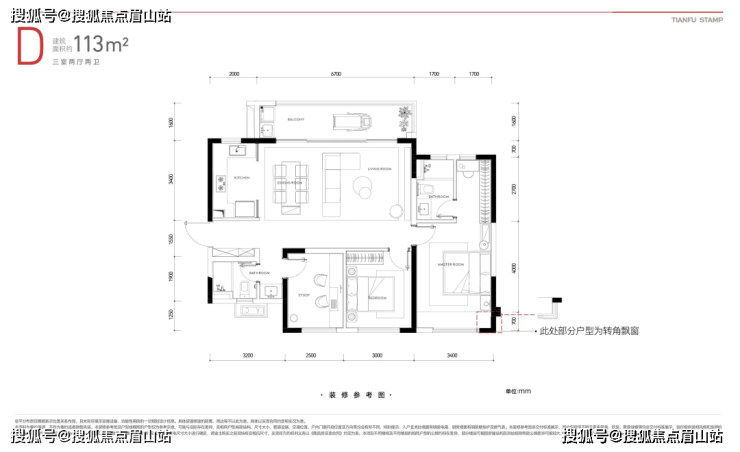 主卧向南,带一个可采光的转角衣帽间,这在113平的户型中比较少见。赠送部分,会有一个1.6米宽,6.7米长的开放式阳台赠送一半的面积,约5.36平;另有主卧飘窗面积全赠送,约2.38平。