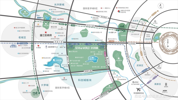 【政务与产业链接区,自带瞩目光环】星河板块位于温江南部集中发展区,东邻行政核芯区,西连产业集群,周边配套丰富且优质。近邻文体公园及全国首个一站式全能体育综合体金强赛事中心。目前,光华新城发展日益饱和,城西顺趋势向南拓展,星河新城作为城市核心区的大规模开发用地,地段价值不彰自显,未来中芯应运而生。