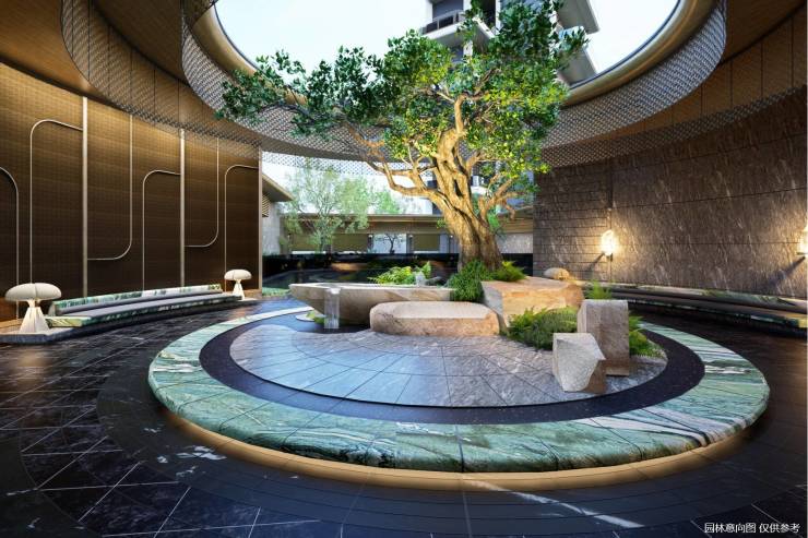 (重点说下,为实现三面景观的视野平权,麓湖金麟樾联合蓝调国际和基准方中,设计了无数个版本,最终决定花重金打造错位的围合式布局,设计了这条约200米的艺术中央景观带)