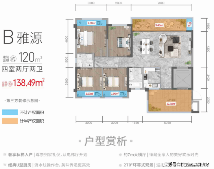 1、市场主流四房,满足三代同堂或者多孩家庭需求;2、私梯入户,可自行打造的阳光前厅;3、约7米超大阳台,270°环幕采光;4、轻奢大横厅,臻藏全家人的美好欢乐时光。