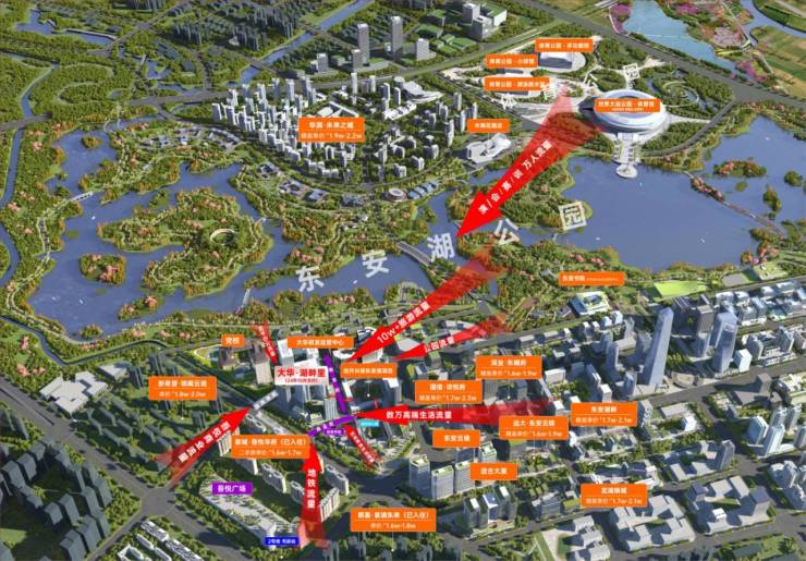 演唱会带动大量人流,东安生态旅游圈,吸附来自世界各地的游客(约5200亩东安湖+东安阁+大剧院+艺术中心等,未来城东文化旅游网红打卡地虹吸全城人潮)