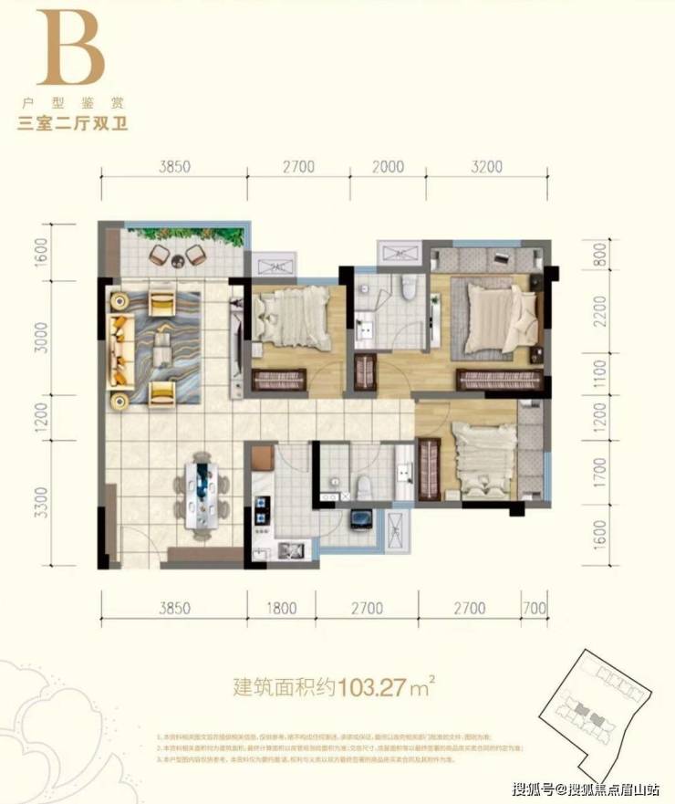 ———【103㎡户型:套三双卫】———→ 户型亮点:精装、两梯四户、3.85米开间