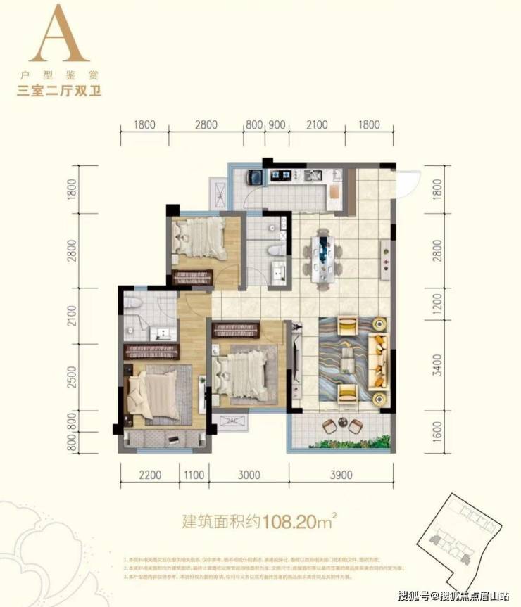 ———【108㎡户型:套三双卫】———→ 户型亮点:精装、两梯四户、3.9米大开间