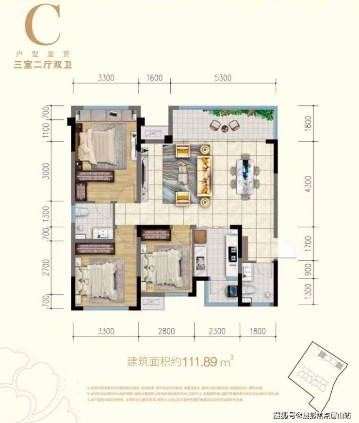———【111㎡户型:套三双卫】———→ 户型亮点:8层真洋房、1T2板式结构、6.9米横厅设计、超大阳台