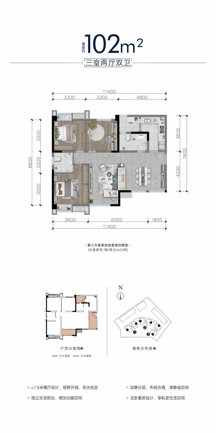 约7.8米横厅设计,视野开阔,采光充足;主卧套房设计,享私密生活空间