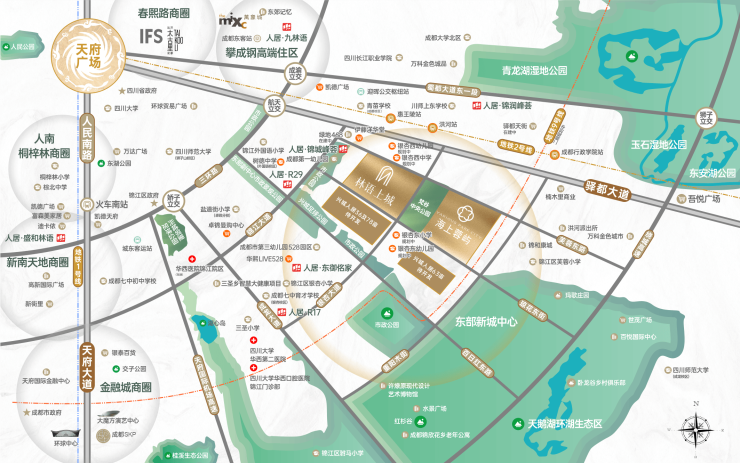 链接成龙大道、东大街-驿都大道、蜀都大道,集萃丰富多元的交通、商业、学校、医疗、生态等配套设施,便捷生活触手可及。