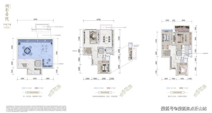 2+1叠,它总共只有3层,下面2层为两套下叠,而3层则是一套大平层,就像一个“品字型”,目前全成都只有麓府藏月和湖光里院有这样的设计。