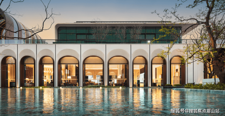 另一方面,商业艺术街区的城市界面打造独具特色,建筑立面整体为两段式划分,以双曲面米白莱姆石+仿铜色金属作连续拱洞柱廊造型,二层以高反射中空玻璃打造超大“玻璃盒子”,街角广场以仿铜色金属+彩釉玻璃打造极具辨识度的圆拱门IP形象,塑造业主的“归家灯塔”。而项目难得一见地将商业艺术街区的城市展示面与社区大门融为一体,整体打造为麓湖公园区的超级城市界面。
