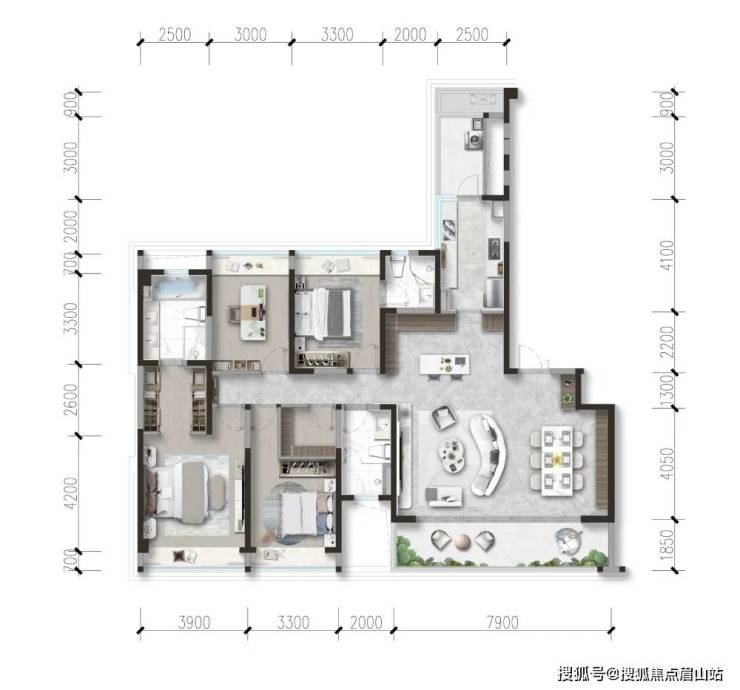 四室两厅三卫,板式结构,约16.1米的极致南向采光面、双阳台设计让空气对流与四季瞰景,都变得无比自然。