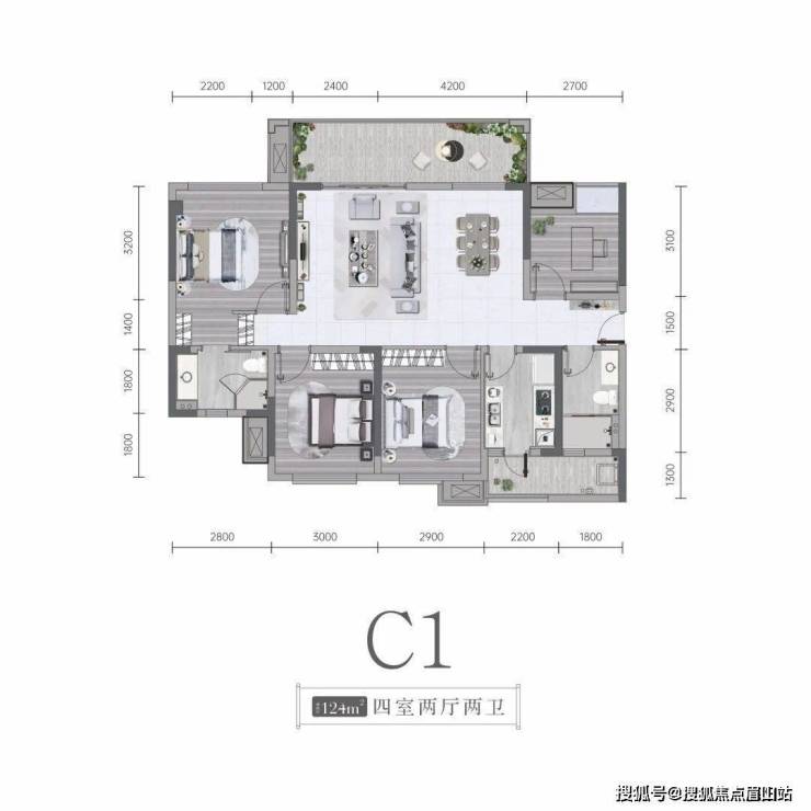 从约124㎡四房的C1户型佼佼者,即可窥见诸多匠心: 约12.7米大面宽,成就大横厅格局,通透性好,采光通风效果俱佳,大大提升居住品质。